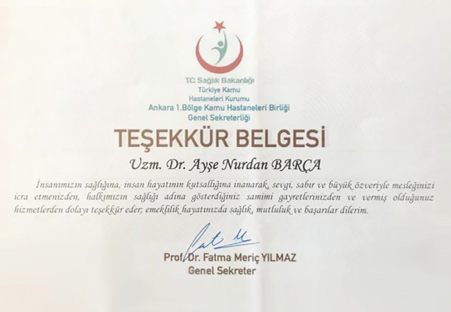 2016 yılında emekli olup halihazırda Sağlık Bakanlığı ile ortak yürütülen Ulusal Meme Kanser Tarama Projesinde çalışmaktayım. Ayni zamanda muayenehanemde hastalarıma hizmet veriyorum. Evli, iki çocuk, bir torun sahibiyim.